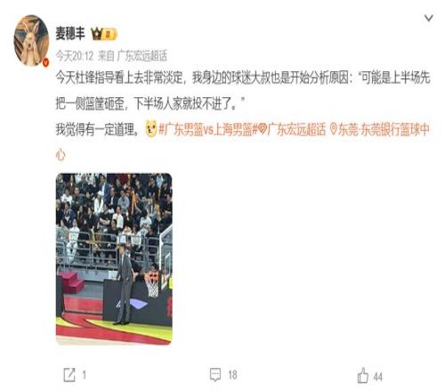 广东媒体人麦穗丰都已经输到调侃主队了:杜锋看上去非常淡定,我身边的大叔开始分析原因‘上半场先把篮筐砸歪,下半场上海就投不进了’,我觉得有一定的道理。